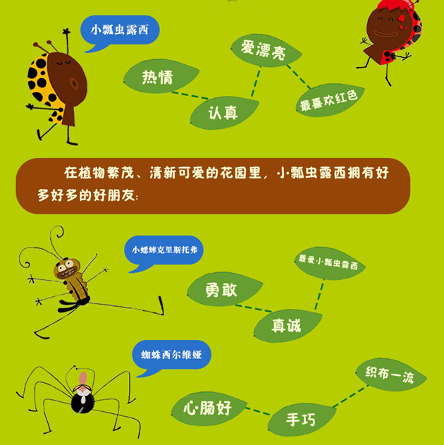 无论孩子还是孩子的爸爸妈妈,都可学学书中的小瓢虫露西,让自己变得更有趣,用那可爱的微笑引来更多的朋友,化险为夷;学学故事里其他可爱的小昆虫,多多留意周围的善意,才能捕捉到友好的微笑;学学这些可爱的小动物们,跨越了彼此之间有很多很多的不一样,快快乐乐过一生!