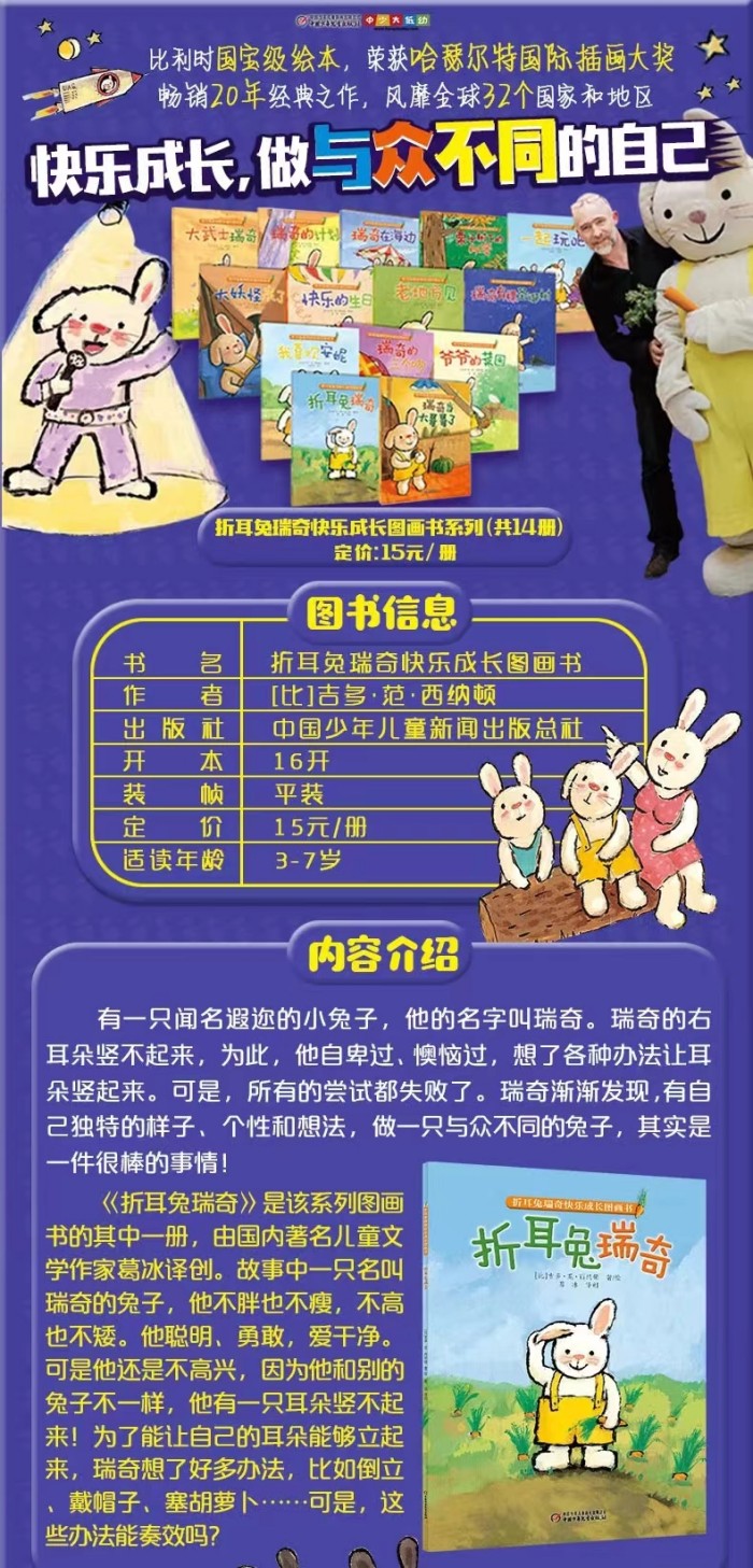 有一只名叫瑞奇的兔子,他不胖也不瘦,不高也不矮。他聪明、勇敢、爱干净。可是他还是不高兴,因为他和别的兔子不一样,他有一只耳朵竖不起来!为了能让自己的耳朵能够立起来,瑞奇想了好多办法,比如倒立、戴帽子、塞胡萝卜...可是,这些办法能奏效吗?