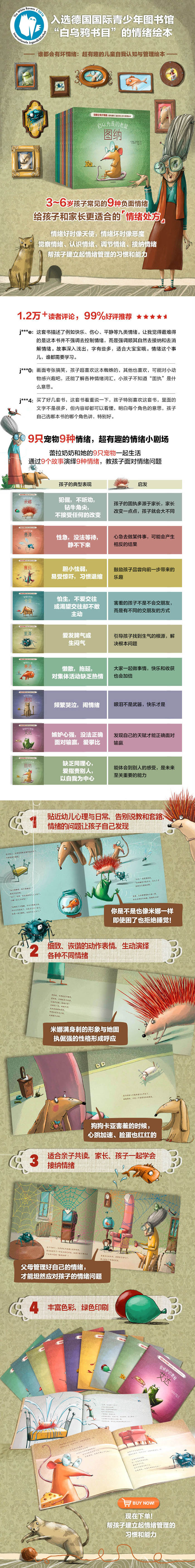 86岁的蕾拉奶奶和她的9只宠物一起生活:苍蝇费泽、小鱼赛法、蜘蛛里泽、狗狗卡亚、猫咪迪拉、青蛙艾达、老鼠图纳、鸟儿赛玛还有刺猬米娜。这些小家伙每一个都称得上是“个性十足”,也常常会有糟糕的坏情绪。一大清早,里泽就在发脾气;大家一起玩儿的时候,米娜又犯固执了;该睡觉了,迪拉却在哭个不停……从故事中透析9种情绪,教孩子如何面对情绪问题,帮孩子建立起管理情绪的能力。