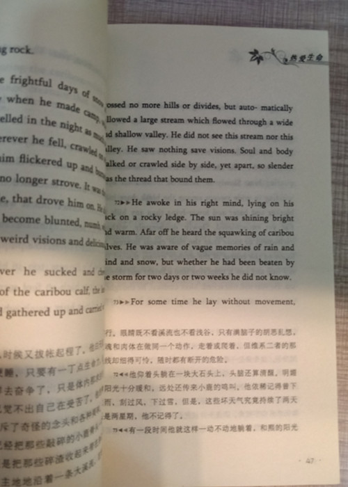 72>He awoke ir i his right mind, lying on his back on a rocky ledg ge. The sun was shining bright and warm. Afar off he heard the squawking of caribou calves. He was aware of vague memories of rain and wind and snow, but whether he had been beaten by the storm for two days or two weeks he did not know.
