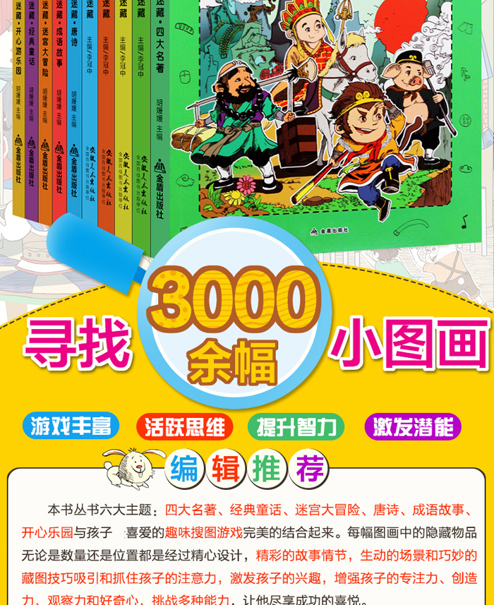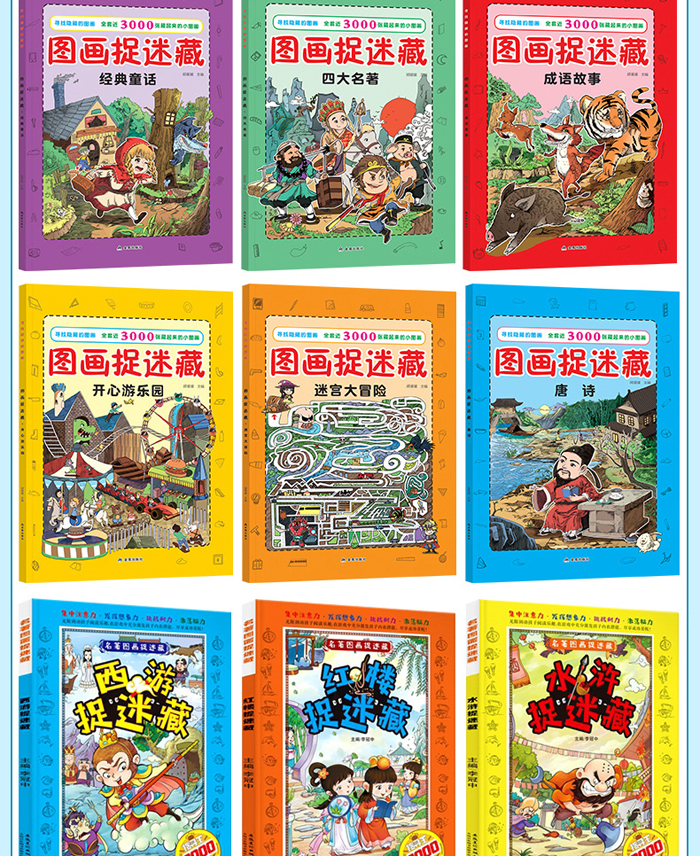 本丛书共分6册,包括《四大名著》《经典童话》《唐诗》《成语故事》《迷宫大冒险》和《开心游乐园》我们将这些孩子们喜闻乐见的内容与趣味搜图游戏完美结合在一起,每幅图通过精心设计,将隐藏物品与画面巧妙绘制,能牢牢抓住孩子的注意力,让其在做游戏时提高专注力和观察力,从而培养孩子的创造力,最终达到激发孩子智力潜能的目的。