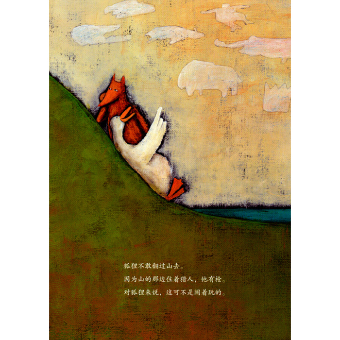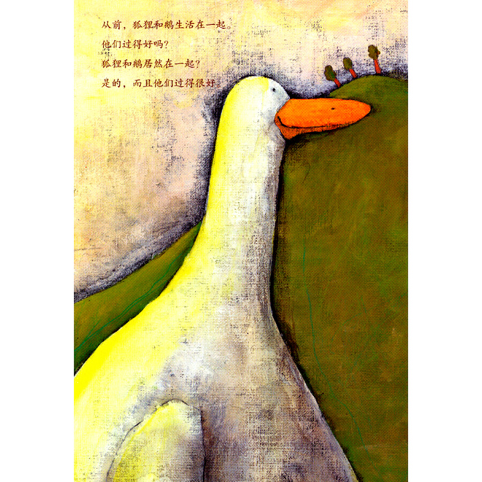 这是一个发生在一只狐狸和一只鹅之间的爱情故事。他们在一起的生活本来过的很好,直到有一天,国王乘着他的金色马车出现了。他在寻找他的新娘,她应该是最美丽的。鹅有点蠢又有点虚荣,于是她登上了国王的马车。最后在婚礼上,鹅才真正发现,她还是更喜欢在山丘的后边和她的狐狸在一起。当然,美丽的童话总会有美丽的结局。