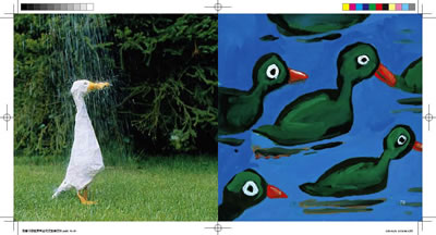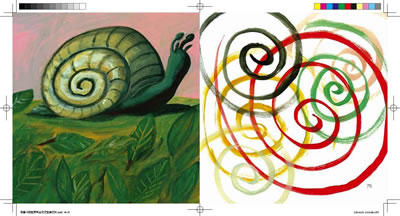 全书真的是对定势思维的大挑战!整本书的格局开放、大气,完全颠覆了我们以往对于一本儿童能看的艺术书籍的想法。每幅作品之间都有微妙的联系,在联系之外,又用幽默的方式,从一个点出其不意的跳跃到另外的点上去,真的是太有趣了!