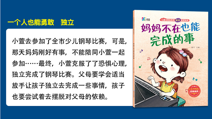 上钢琴课时,妈妈会在教室外等着我,在家练琴时,妈妈会陪在我身边。可是,参加比赛时,妈妈却不能在身边了,我好怕自己不能完成比赛!宝贝,不要害怕,这次独立参加比赛,会让你变得更强大哦,成长的道路上,妈妈会一直在背后关注你。