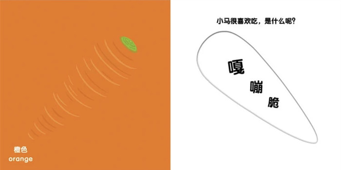 “小马很喜欢吃,是什么呢?”“嘎嘣脆”“吃了它长得壮,是胡萝卜。”有趣的文字游戏,鲜艳的色彩,帮助婴幼儿在游戏中认识常见的蔬菜。结合挖洞翻页的触觉体验,将图形与知识融合,培养幼儿形象思维能力。 “橙色,orange”,“小马很喜欢吃,是什么呢?”“嘎嘣脆”“吃了它长得壮,是胡萝卜”“胡萝卜,carrot”。 在游戏中不仅可以认知浅黄绿色(yellowish green)、紫色(violet)、土黄色(ocher)各种颜色名称及英文,还可以认知圆白菜(cabbage)、茄子(eggplant)、土豆(potato)等常见的蔬菜、英文拼写,以及各蔬菜的特征。