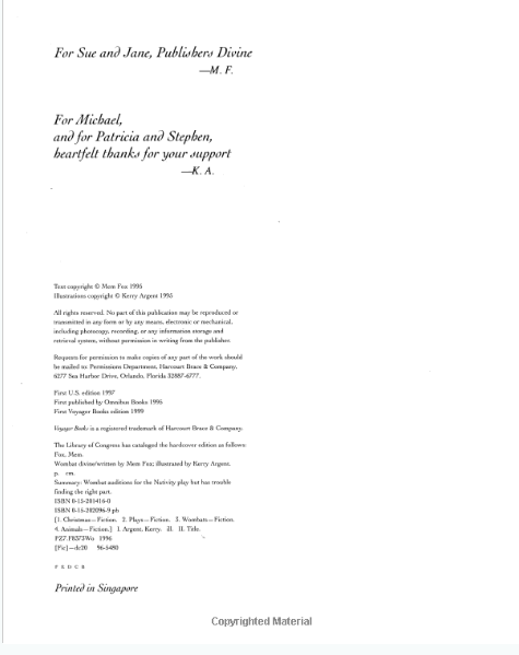 Wombat tries out for the annual Nativity play and wins the role of Jesus. In a starred review of this playful story, PW said, "Its pleasures are infectious." Ages 4-8. (Oct.)