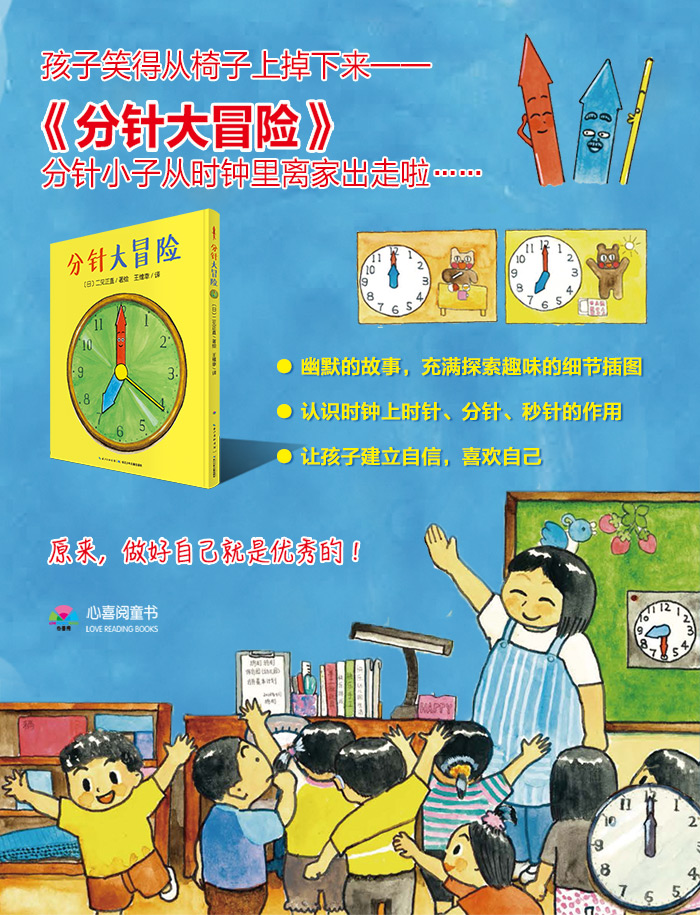 绘本《分针大冒险》中的分针小子产生了不想再做自己的念头,他常常思考什么样才算最棒的。它学着时针爷爷一动不动,跟着秒针小子比赛快跑,混进胡萝卜里面还差点被切掉,假装筷子又险被扔掉……分针小子一路上像孙悟空一样七十二变,为的就是成为心目中最棒的东西。他能发现自己心目中最棒的东西吗?