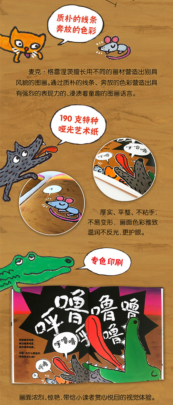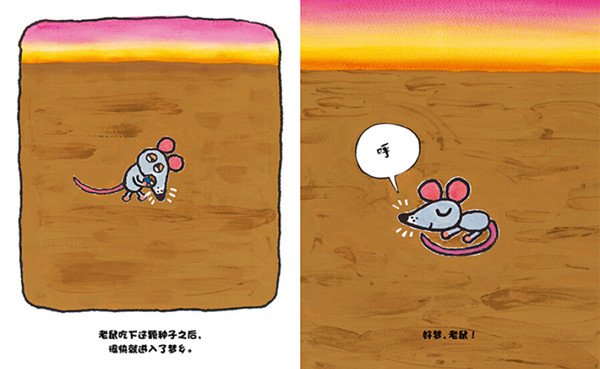 一颗有魔力的催眠种子,让接踵而来的小老鼠、猫、大灰狼和鳄鱼都进入了梦乡。在小动物们睡得正香时,鳄鱼巨大的鼾声把大家都吵醒了。可是对另外一只鳄鱼来说,这鼾声却是催眠曲,两只鳄鱼越睡越沉,鼾声也越来越响……