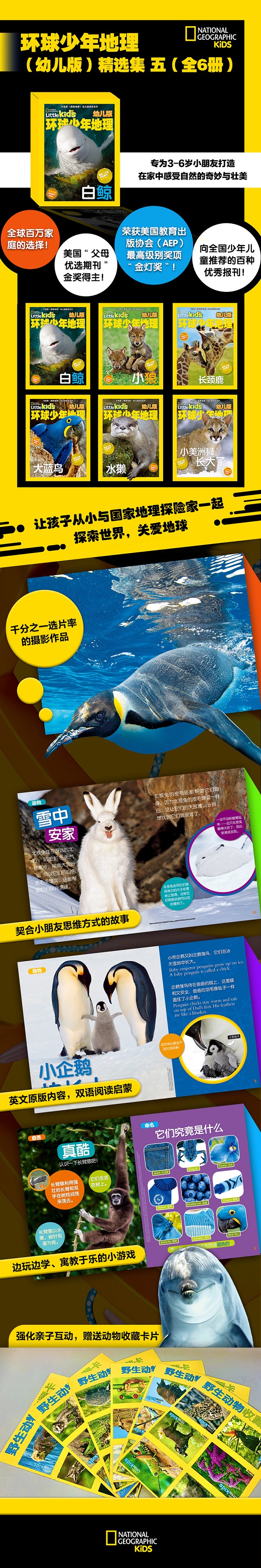简单的故事有助于学前科普及幼儿双语阅读 清晰、大字体的印刷对孩子们认知字母及中文非常有帮助 认知动物 有趣的事实有助于孩子们认知动物,彩色的图片有助于孩子观察、了解身边的各种动物 学中玩 玩中学 有趣的迷宫、谜语等互动游戏有助于孩子们学到知识 动物收藏卡 全球13个国家40多位美国《国家地理》的*摄影师拍摄的野生动物卡,卡后的趣味知识连父母也不一定知道 美国出版界及家长的认可 美国国家地理幼儿版得到了教育出版协会及广大家长的认可,包括获得美国教育出版商协会颁发的*荣誉“金灯奖”,并且连续三年获得美国年度期刊奖Parents' Choice Award金奖,被全世界很多家长推崇为杂志。