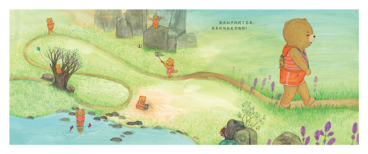 《时间迷了路》里的小熊康米就是幼童的化身,因为妈妈责怪他浪费时间,于是他出门寻找时间去了。时间究竟是不是迷了路?*终小熊为自己找到了一个完美的答案。孩子天真、单纯的逻辑和不同寻常的思维方式,让这个故事充满丰富的哲学意味。丧失了好奇心与求知欲的大人们或许不会去思考身边的哲学命题,天性通透的孩子却非如此。他们用*鲜的眼光来看这个世界,由此洞见永恒的真理。曹文轩先生曾说,“绘本是离哲学*近的书”。文学的轻盈和哲学的重量,就在《时间迷了路》这样一本小小的书里实现了奇妙的结合。童真的追问,也因此得到了解答。