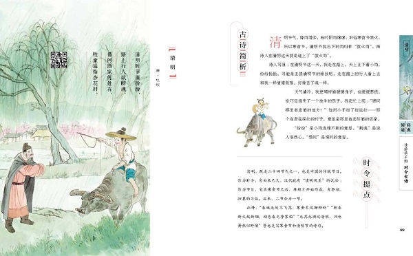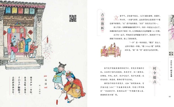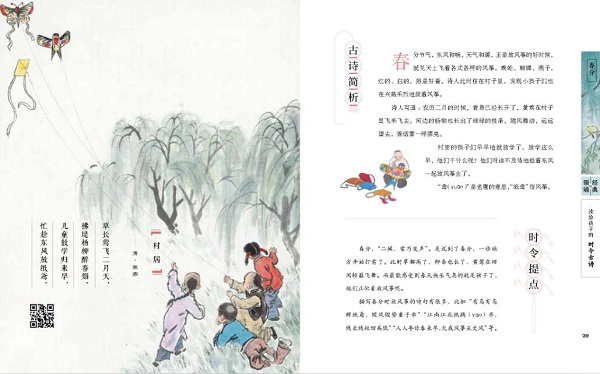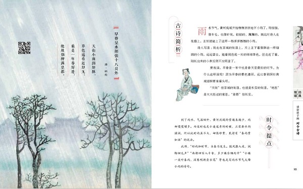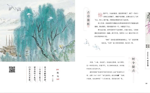 读一读这些时令古诗 中华诗词学会副会长 / 高昌 童年就像一朵花儿慢慢开放。诗就像一滴甘露,润泽每一颗花儿般的童心。 读一读这些时令古诗,仿佛在和古人交换亲切的心灵密码。这些有温度的文字就像会跳舞的小行星一样,闪耀着灿烂而美好的光芒,让每一段岁月都变得如沐春风,让每一双眼睛都变得清澈明亮。 按传统节气组合的时令古诗,列成整齐的队伍徐徐而来,联结起美丽的光阴,把岁月的脚步装饰得芬芳而清新。希望这里的每一首小诗,都能在童心的磷片上划出一小朵灿烂的火花,照亮每一个美好的小瞬间。 宋朝诗人苏东坡说:“腹有诗书气自华。”一个孩子的教养,跟家庭贫富无关,而是取决于孩子的内心世界是否丰盈。在童年播种一粒诗的花籽儿,就有可能收获一生的芬芳和明媚。让诗歌的光芒照耀生命之河,孩子未来的世界里就会增添一份不一样的优雅、淡定和潇洒。 给孩子买的书,在质不在量;给孩子读的诗,在精不在多。精美的国画、动听的领诵、精彩的赏析、传统的时令,组合成一个美妙、清爽的情境空间,给孩子们带来久远、深刻的精神力量。我愿意向所有的孩子和孩子家长推荐这本美丽的时令古诗。人类本真、纯粹的情感,总是能唤起不同年代的人们广泛、真实的心灵共鸣。
