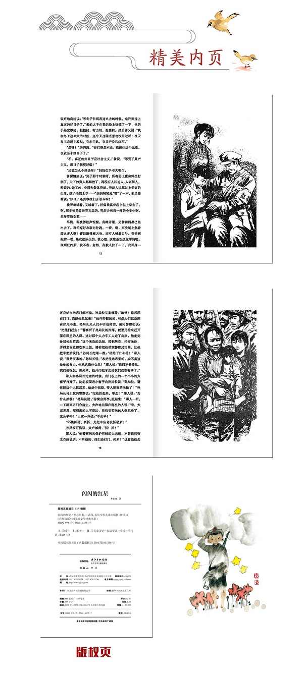【专家及媒体评论】 这一辈子的童年,充满着多少挣扎与苦斗啊,为了不忘记这一些,并把它告诉给后人,于是我写了《闪闪的红星》。 ——李心田(著名作家,本书作者) 这部作品感情饱满,爱憎分明,情节紧凑,扣人心弦,深受广大少年儿童读者喜爱,是对少年儿童进行革命传统教育的形象化教材。 ——赵耀堂(山东友谊出版社原社长兼总编辑,文学理论家)