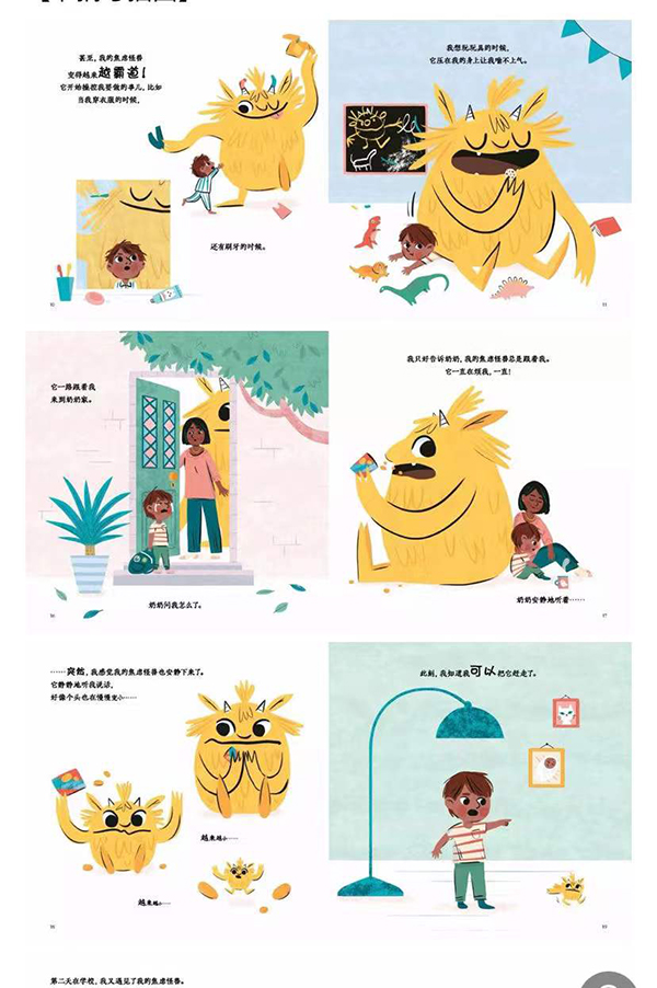 有一只焦虑怪兽时常伴随在男孩左右,不论男孩是在刷牙,玩玩具还是睡觉……男孩很想摆脱它,可是不自觉地被他控制。怪兽和我将焦虑情绪比喻成一个怪兽不断小男孩儿刷牙、出门、找朋友玩耍,上学还是睡觉,这个怪兽总是形影不离的跟着他。他平时总是安静地呆在小男孩儿的口袋里,偶尔发作的时候会对着小男孩大吼大叫。直到有一天,小男孩儿跟奶奶说出了怪兽的事,然后他发现,当他开口谈论怪兽的时候,怪兽竟然变得越来越小小到可以被他赶走