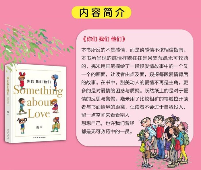 《你们我们他们》并不是一本感情指南,更应该说是一本反感情指南。《你们我们他们》里所反的不是感情,而是谈感情不该相信指南。本书所呈现的感情样貌往往是呆笨荒愚无可救药的,幾米用画笔描绘了一段段爱情故事中的一个又一个的画面,让读者由点及面,窥探每段爱情背后的故事。在书中,甜美动人的爱情不再是主角,更多的是对爱情的困惑与质疑。跃然纸上的是对于爱情的反思与警惕。幾米用了比较粗犷的笔触拉开读者与书面情境的距离,让读者不会过于自我投入,留一点空间来看看别人想想自己,也许我们曾经都是无可救药中的一员。