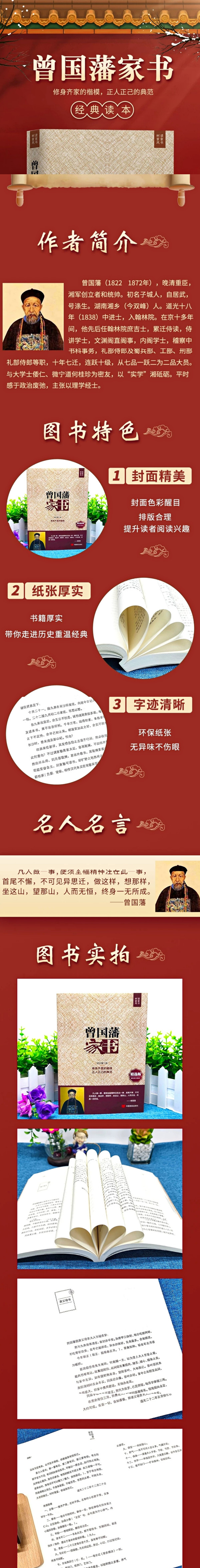 本书是曾国藩的书信集,成书于清19世纪中叶。该书信集记录了曾国藩在清道光30年至同治10年前后达30年的翰苑和从武生涯。所涉及的内容极为广泛,是曾国藩一生的主要活动和其治政、治家、治学之道的生动反映。曾氏家书行文从容镇定,形式自由,随想而到,挥笔自如,在平淡家常中蕴育真知良言,具有极强的说服力和感召力。