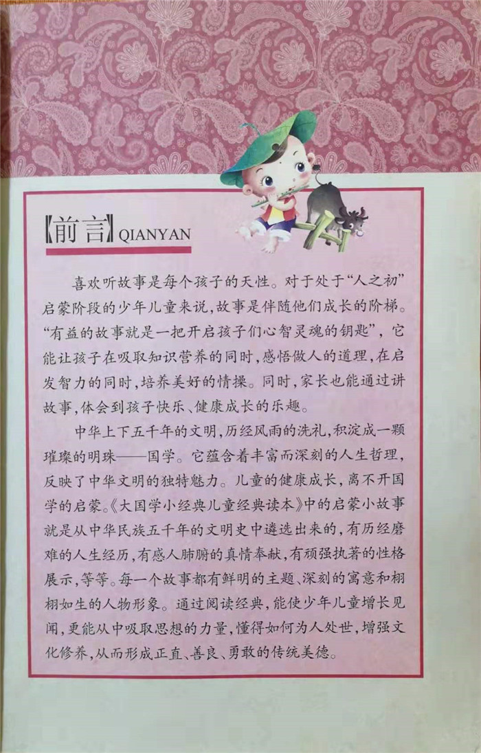 《大国学小经典儿童经典读本》中的启蒙小故事就是从中华民族五千年的文明史中遴选出来的,有历经磨难的人生经历,有感人肺腑的真情奉献,有顽强执著的性格展示,等等。每一个故事都有鲜明的主题、深刻的寓意和徐徐如生的人物形象。通过阅读经典,能使少年儿童增长见闻,更能从中吸取思想的力量,懂得如何为人处世,增强文化修养,从而形成正直、善良、勇敢的传统美德,