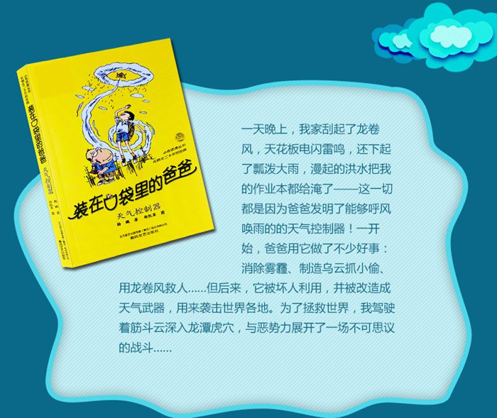 杨鹏、郑凯军绘图的这本《装在口袋里的爸爸 (天气控制器)》讲述了: 一天晚上,我家刮起了龙卷风,天花板电闪雷鸣 ,还下起了瓢泼大雨,漫起的洪水把我的作业本都给 淹了——这一切都是因为爸爸发明了能够呼风唤雨的 天气控制器!一开始,爸爸用它做了不少好事:消除 雾霾、制造乌云抓小偷、用龙卷风救人……但后来, 它被坏人利用,并被改造成天气武器,用来袭击世界 各地。为了拯救世界,我驾驶着筋斗云深入龙潭虎穴 ,与恶势力展开了一场不可思议的战斗……