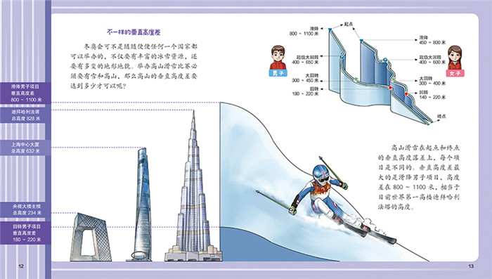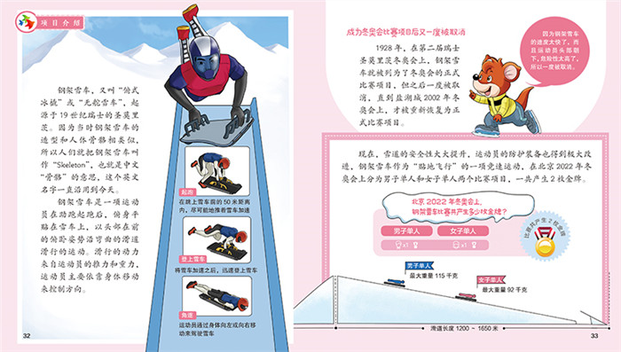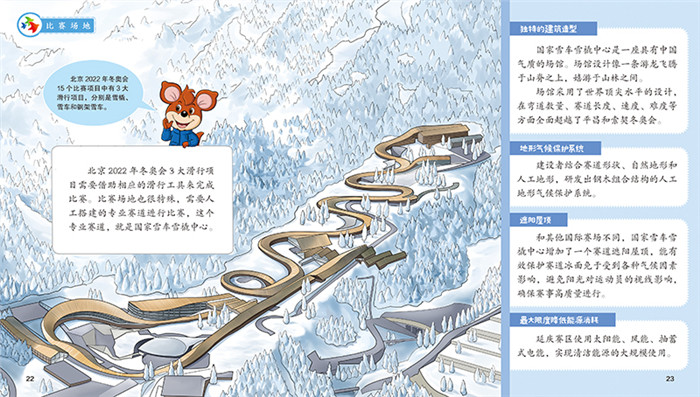 系统立体,全景式展现北京冬奥会 趣谈知识、探索科技2个大方面讲述北京冬奥会的周边知识及科技创新;冰韵北京、雪动延庆、雪舞崇礼3个赛区讲述北京冬奥会的15个比赛项目。 分阶分龄,难度自主把控 趣谈知识、探索科技的读者对象面向5~8岁的孩子,是关于知识和科技的普及性读物;冰韵北京、雪动延庆、雪舞崇礼面向6~13岁的少年儿童,是对每个比赛项目的详细介绍。 层层把关,内容专业权威 《探秘北京冬奥会》由致力于在少年儿童中开展奥林匹克教育,弘扬奥林匹克精神的北京奥运城市发展促进会牵头,首都体育学院专业团队组稿,内容经过层层把关、重重审核,知识内容专业权威。 你问我答,形式趣味活泼 在兼顾知识性的同时,充满趣味性和可读性。红袋鼠和火帽子活泼俏皮的对话穿插其中,把一个个枯燥的冬奥知识生动地串联起来,语言深入浅出、活泼可爱。 可读可听,全方位探秘北京冬奥会 封底配有二维码,读者可扫描二维码,听冬奥会项目运动员或教练员或相关工作人员讲述他们的冬奥故事,感受他们超越自我、不轻言放弃的拼搏精神。