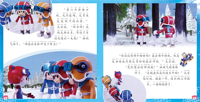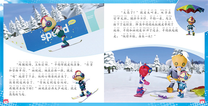 《冰雪冬奥村超越自我拼音认读故事书》系列共6册,改编自北京卡酷传媒有限公司设计制作的动画片《冰雪冬奥村》。书中由金钱豹、藏羚羊、大熊猫等可爱动物变身而成的萌趣角色,共同演绎冰雪运动的魅力,讲述与冬奥有关的故事,向少年儿童传递办奥理念、弘扬奥运精神。 《滑雪冠军》一册包含两个故事——《让脆皮飞》和《滑雪冠军》。特援队要和长臂猿三兄弟来一场跳台滑雪团体赛,可是,脆皮有恐高症,他能克服恐惧,完成完美一跳吗?作为冬奥山滑雪快的人,斑妮有些骄傲,开始不好好练习了,她还能在越野滑雪比赛中赢过长臂猿三兄弟吗?故事之后,还有专门的冬奥知识页,介绍“跳台滑雪”和“越野滑雪”。