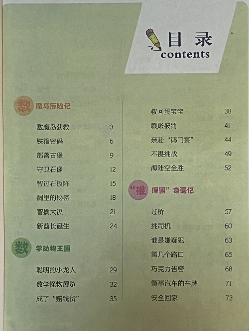 该书由《图图闹天宫》《剪刀王国历险记》《“推理国”奇遇记》《毛豆和外星宝贝》《荒岛历险记》《数学动物王国》六个故事组成,故事类型丰富,有神话故事、童话故事、冒险故事、科幻故事,适合小学四年级学生阅读。全书故事情节紧凑,人物形象鲜明,文字诙谐幽默,注意导向,宣扬正能量,将小学四年级数学的知识点融入故事中,每个故事的每一节都合理安排一到两个知识点,学生既能阅读各种精彩的故事,提高阅读能力,又能巩固数学知识,一举两得。