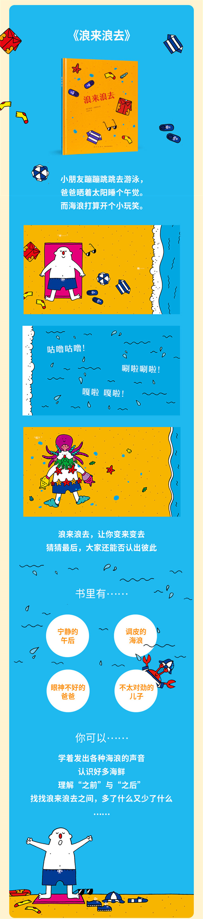 小朋友蹦蹦跳跳去游泳,爸爸晒着太阳睡个午觉。而海浪打算开个小玩笑。