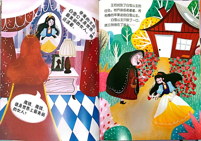 本书讲述了故事讲述了白雪公主遭到继母嫉恨,不得不躲进七个小矮人家。可继母假扮成老妇人哄骗白雪公主吃下毒苹果。在小矮人伤心告别白雪公主的时候,王子出现了。白雪公主吐出毒苹果,和王子过上了幸福生活。