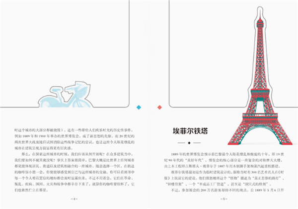 “纸上之城”系列书引进自著名科普出版社卡尔顿图书出版社,该系列书是一套极为精美的人文艺术科普书,采用富有创意的上图下文设计,将城市变成一道亮丽的风景,向小读者介绍关于一个城市标志性建筑的相关内容。该本主题为“巴黎”,巴黎是一座具有历史底蕴的现代化城市。艺术新一代的建筑与高科技相碰撞,甚至当你走在一条街道上时,你会惊讶地发现这条街道上的建筑风格可能横跨了几个世纪。该书采用了独特模切工艺,让小读者在享受阅读时,还能动手撕出一个个美丽的建筑,打造出一个具有魅力的立体城市景观。该书文字优美,插图精美,极富视觉享受。