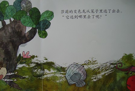 莎莉终于找到变色龙了。她是怎么找到它的呢?“因为变色龙忘了把自己脖子上的绿色领结摘下来了。”