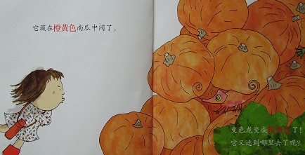 当时买回这本书时,奇奇已经认识了很多种颜色,但还是非常喜爱这本书,特别喜欢在同种颜色中寻找“玩躲猫猫”的变色龙。现在奇奇三岁了,仍然会时不时的选这本书让妈妈陪他阅读,也很快掌握了书中几种颜色的英语单词。更多的时候是作为奇奇独立阅读的范本,因为故事情节的简单,奇奇很容易独自讲完,很有成就感。