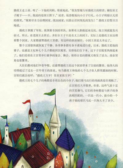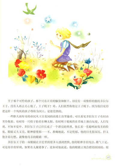 《最能打动孩子心灵的世界经典童话:瘸腿小王子》讲述了在洗礼仪式上,粗心的侍女摔断了多拉尔王子的腿。不久,王子的母后和父王相继去世.王子的叔叔篡夺了王位,把年幼的他囚禁在荒原的高塔里。多拉尔王子在高塔里渐渐长大,枯燥乏味的生活让他窒息,他迫切地希望生活发生一些改变。就在这时,一位仙子教母出现了。她送给多拉尔王子一件会飞的斗篷,斗篷带着多拉尔周游世界。起初,大自然的风景让他激动不已。渐渐地,他发现自己与正常人是不同的,这让他异常痛苦和沮丧。可是,当他看到人世间还有很多人正处千更大的下幸中时,他忘却了自己的痛苦。最后,篡位的叔叔在叛乱中死去。多拉尔重新当上国王,并承担起拯救国家的使命。