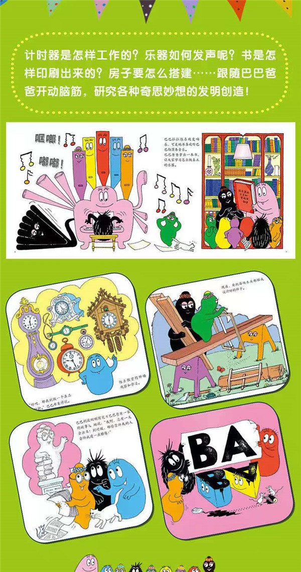 “可里可里可里,巴巴变!”在中国,这是曾经家喻户晓的动画台词。 巴巴爸爸的形象由法国漫画家德鲁斯泰勒和他的妻子安娜特缇森所创作。系列图书的*部《巴巴爸爸的诞生》出版于1970年,图书刚一问世就获得了英国文艺评论界权威的赞誉,并在博洛尼亚书展上受到广泛好评。1975年,法国和荷兰将巴巴爸爸的故事改编成动画片,随后在比利时、瑞典、德国、意大利等11个欧洲国家播出,很快风靡全球。巴巴爸爸以他的独创性和幽默感,为世界的大孩子和小孩子们提供了快乐。巴巴爸爸一家的和睦、温馨、相亲相爱,永远温暖着全世界人们的心灵。 在“巴巴爸爸发明故事”中,巴巴爸爸一家带着小读者们一起探索各行各业的奥秘——纺织缝纫、种田养花、制陶打铁、珍珠采集、玻璃制作、书籍印刷……奇思妙想、五花八门的发明创造,随心所欲、变来变去的神奇能力让探索的过程充满惊喜与欢乐。