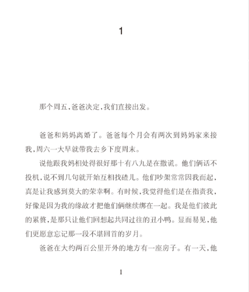 爸爸和妈妈离婚了。爸爸每个月会有两次到妈妈家来接我,周六一大早就带我去乡下度周末。