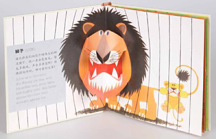 狮子(lion)大王一身金色皮毛,鬃毛威风,声音洪亮!谁是威风凛凛的狮王陛下的朋友?这一本还向小朋友们介绍了急脾气的*(bison)、长着毒牙的蛇(snake),和在育儿袋里养育宝宝的可爱袋鼠(kangaroo)。