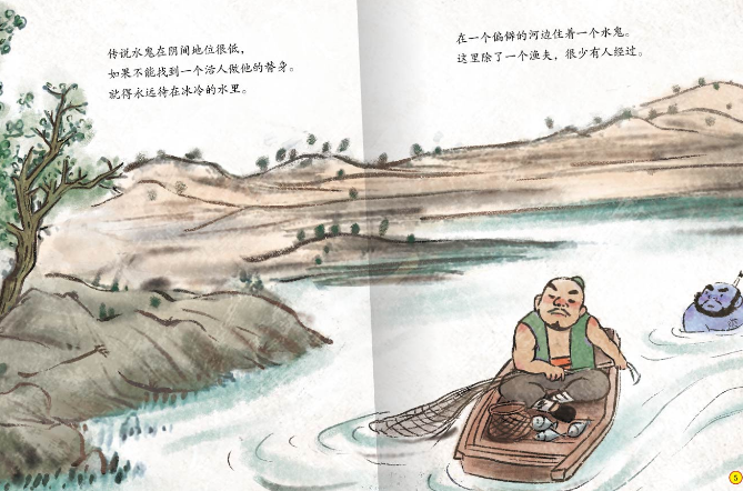 《水鬼/中国传统故事系列》内容根据古代中国民间故事改编,讲述了一个热心的渔夫和一个落魄的水鬼友谊的故事,渔夫反复阻挠水鬼去害人,终于打动水鬼,决定再也不害人,反而因此有了更好的结果。