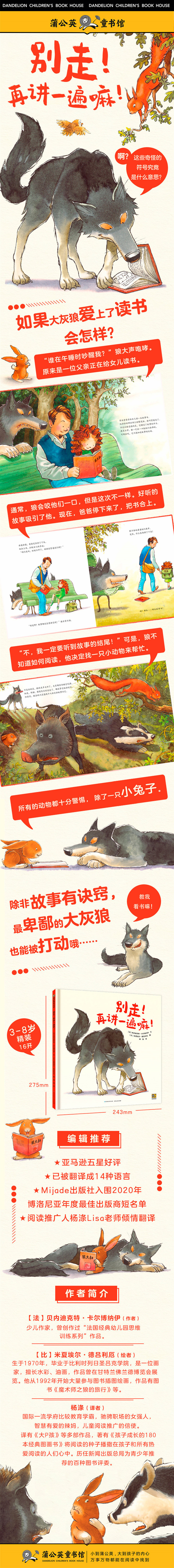 亚马逊五星好评 已被翻译成14种语言 Mijade出版社入围2020年博洛尼亚年度出版商短名单 读书不止让狼快乐,也让狼收获了友谊,在孩子人际交往的层面上也具有一定的参考价值,告诉孩子,你需要对他人表现善意,以及共同的爱好可以让人获得友谊。