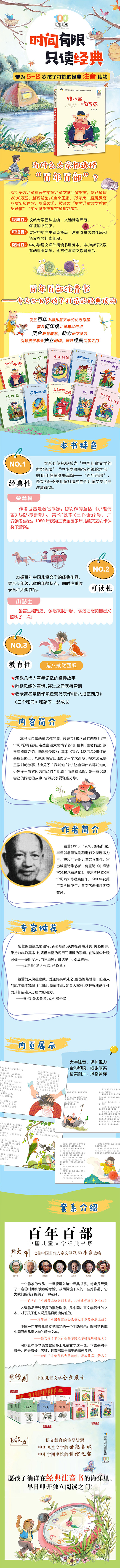 本书是包蕾的童话作品集,收录了《猪八戒吃西瓜》《三个和尚》等名篇。这些童话大多情节诙谐、曲折,生动有趣,读来有捧腹之感,也能颇受教益。其中《猪八戒吃西瓜》讲述的是取经路上,八戒因为贪吃独吞了一个大西瓜,被大师兄悟空教训的故事。《小兔子“我知道”》讲述自诩什么都知道的小兔子一次次因为自己的“知道”而遭遇危险,终于意识到自己的问题的故事,告诉孩子要谦虚好学。