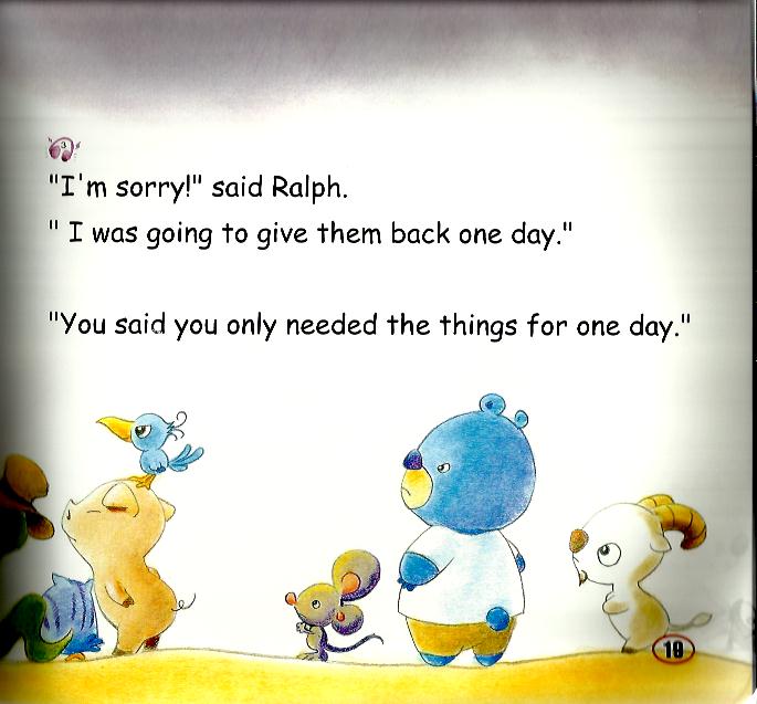 《新东方生命教育美语绘本·人人系列:我答应》中的小狗瑞夫搬到了睡树城后,发生了一些事,是什么事呢?小朋友,你有没有被别人伤害过,但是却一直无法忘记呢?不管别人是有心的还是无意的,我们自己会把这样的伤害筑成一个牢笼,将自己关在里面,让伤害、气愤、难过在心里发酵,而变得很不快乐。而打开牢笼的那把钥匙就是原谅别人,宽恕别人有时不是一件很容易的事,但它可以让你的心灵获得释放,并再次自由地飞翔哦!