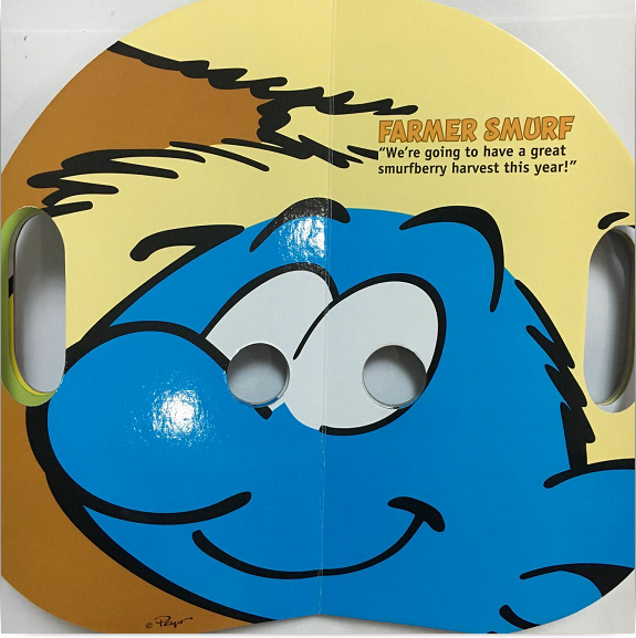 今天,孩子们可以尽情的加入到蓝精灵的大乐园中。众多周边产品,深受儿童们的喜爱。书本的创新样式层出不穷——好玩的蓝精灵面具书诞生!圆圆的纸板脸谱书,方便手拿的两个小洞,带上面具加入蓝精灵家族吧!