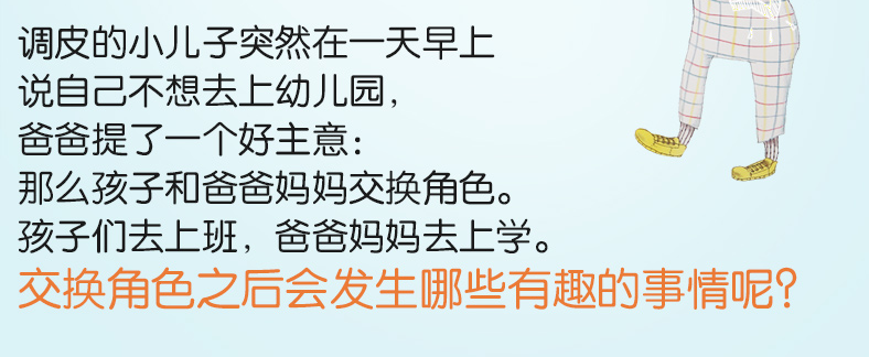 这是关于一个大人和孩子互换角色的故事。调皮的小儿子突然在一天早上说自己不想去上幼儿园,爸爸提了一个好主意:那么孩子和爸爸妈妈交换角色。孩子们去上班,爸爸妈妈去上学。这样的角色交换后不仅仅让孩子们体验到了作为大人应该付出的责任,爸爸妈妈也体验到了回到童年的快乐,也了解到孩子们现在*