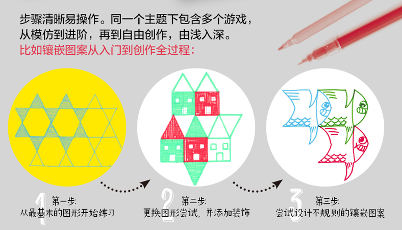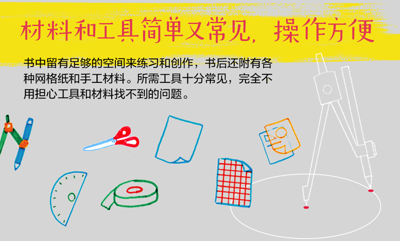 每个创意和说明后面都留有空白,书后还附有彩色方格纸、三角格纸,更加便于练习和创作。特别设计20厘米宽的封面大折口,有厚度的卡纸刚刚好适合垫在内页纸下方画图!