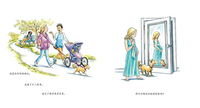 “我可以感觉到你了。刚开始像豌豆,然后像柠檬,接着像茄子。我遵从所有的建议。我读了十二本书。我吃了很多很多菠菜。你可以感受到我很紧张吗?我轻摇着你。我紧抱着你。我喂你吃东西。我愿意花一辈子的时间为你做很多事,只为了让你开心。我生下了你,而你让我成为了妈妈。”