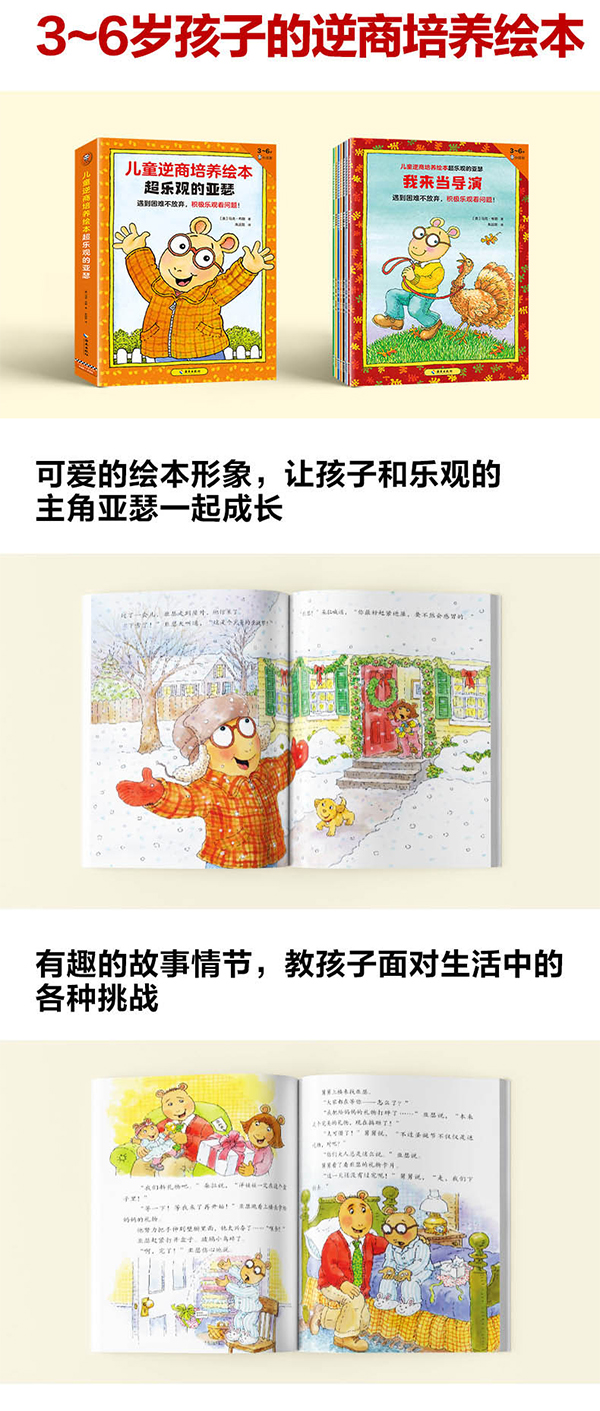 这是一套适合 3~6 岁孩子阅读的逆商培养绘本,让孩子和乐观积极的主角亚瑟(土豚/非洲食蚁兽)一起成长,遇到困难不放弃,积极乐观看问题! 《我来当导演》教孩子如何面对困难,让孩子学会担当,积极解决问题; 《不完美也很有趣》教孩子如何面对挫折,让孩子用积极乐观的心态看待问题; 《我战胜了恐惧》教孩子如何面对恐惧,鼓励孩子直面、克服恐惧; 《戴眼镜也没关系》教孩子如何面对嘲笑,告诉孩子要接纳自己,帮孩子建立自信; 《我不想再撒谎了》教孩子如何面对错误,告诉孩子诚实的重要性; 《别想欺负我》教孩子如何面对霸凌; 《次去野营》教孩子如何面对新事物,让孩子勇敢迈出步!