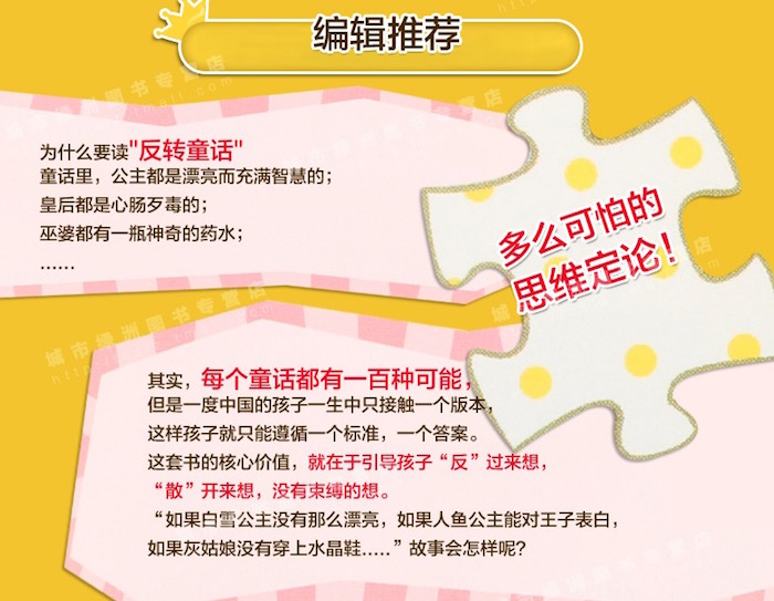 这本由北京联合出版公司出品的《反转童话(套装共12册)》主要童话原著和一个根据原著改编的反转童话构成。通过原著与颠覆性的反转故事不同结局的对比,启发孩子的创造性及发散思维,让孩子们接受不同的视角、不同的观点、不同的答案、不同的思维。在故事之后,还设置逻辑思维练习,通过提出问题——设置假设——人物分析——找到解决方法——得出结论的过程,培养条理清晰的逻辑思维。
