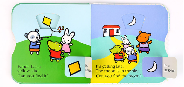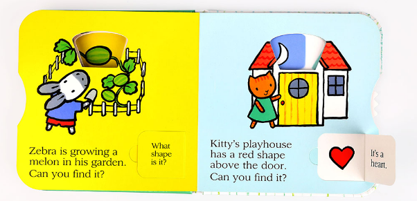 底部会有提问“What shape is the...?” 翻开问号小页,就会出现正确的图像和答案。根据“转转”页中所示图找到想想对应形状的单词如何读呢?