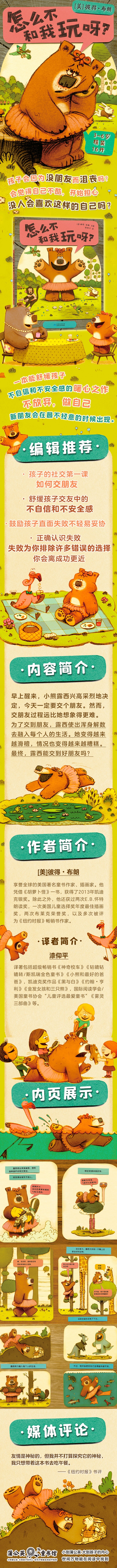 早上醒来,小熊露西兴高采烈地决定,今天一定要交个朋友。然而,交朋友过程远比她想象得更难。她搅乱了长颈鹿的早餐,弄坏了青蛙的泳池……为了交到朋友,露西使出浑身解数去融入每个人的生活——她开始穿袋鼠服、吃树干。她变得越来越滑稽,情况也变得越来越糟糕。终,露西能交到好朋友吗? 孩子的社交课——如何交朋友。 第一:永远做你自己,真正的朋友会喜欢真实的你; 第二:不要放弃,也不要伤心,新朋友会在你不经意的时候出现; 第三:永远不要大叫“你必须成为我的朋友!”这招儿从没成功过。 舒缓孩子交友中的不自信和不安全感。 不用为朋友的离开过度伤心,因为真正的朋友会在了解真实的你后,仍选择不离开。做好自己,加上一点耐心的等待,你和你的朋友正在互相靠近。 鼓励孩子面对失败不轻易妥协。 故事中的露西交友一直不顺利,但她没有放弃。如果没有她的坚持,也许她和她的朋友需要更久才能相...