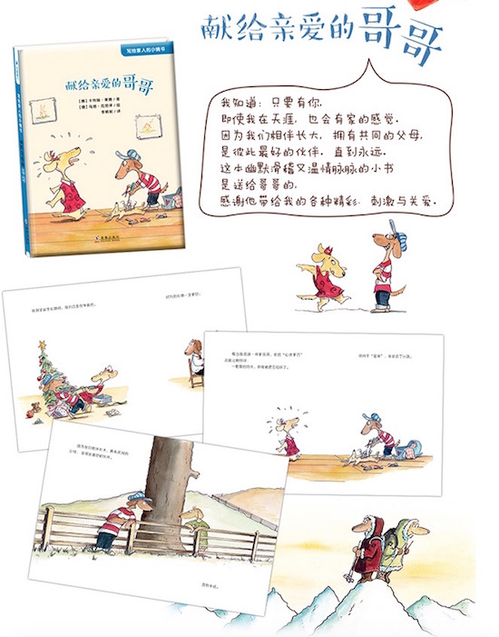 《献给亲爱的哥哥》我知道:只要有你,即使我在天涯,也会有家的感觉。因为我们相伴长大,拥有共同的父母,是彼此最好的伙伴。直到永远。这本幽默滑稽又温情脉脉的小书是送给哥哥的,感谢他带给我的各种精彩、刺激与关爱。
