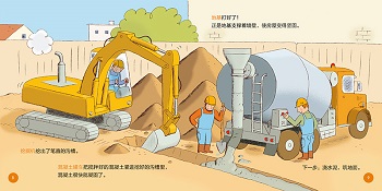 欢迎来到建筑工地!这里有负责挖土的挖掘机,负责运送泥土的翻斗卡车,负责搬运重物的起重机……建筑工地好热闹呀!