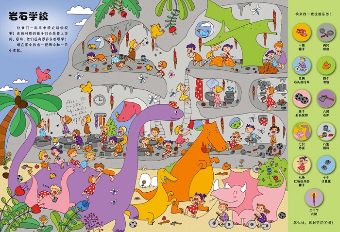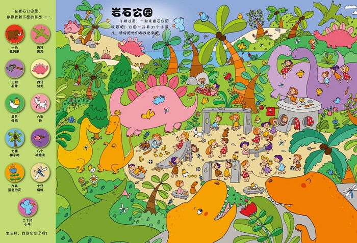 一觉醒来,我们来到了史前时代,那里有各种各样的恐龙,那时,恐龙和人类是生活在一起的,它们总是喜欢帮助人类。我们一起来探索恐龙的世界吧!在这里,你将挑战1001个任务,畅玩岩石之城,参加他们的聚会,逛逛那里的公园和商场,在令人馋涎欲滴岩石餐厅享用一份大餐,和那里的小朋友们在石壁上画画,在沙滩上玩耍,是不是很有意思呢?玩累了,我们还可以做些简单的游戏,比如连线、涂色、比眼力、找路线。这些都是小朋友们要完成的任务哦!