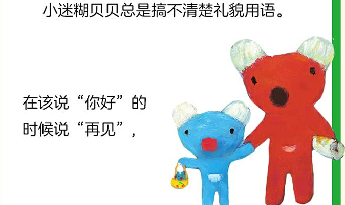一只可爱的蓝色小考拉(3岁的小女孩)贝贝。她有时迷糊,有时调皮,但是贝贝很“能干”,什么事情都想自己做,就算经常会出错,但是贝贝还是想要自己来。 1-《贝贝自己穿衣服》 贝贝想要自己穿衣服。可是先穿什么呢?外套吗?小丸子是给手指头穿的吗?哎哟哟,可不能两条腿伸到同一条裤腿呢!快来和贝贝一起练习自己穿衣服吧! 2-《贝贝学会说“谢谢”》 小迷糊贝贝总是搞不清楚礼貌用语。在该说“你好”的时候说“再见”,该说“对不起”的时候说“谢谢”,该说“谢谢”的时候说“对不起”……在爸爸妈妈的帮助下,贝贝能学会礼貌用语吗? 3-《贝贝自己能改正》 新的一周来临,贝贝又可以回到幼儿园,和小朋友们一起玩了。小迷糊贝贝,穿着拖鞋就出门啦,还忘了换上运动服……不过还好,贝贝自己发现了错误,全部改正啦! 4-《贝贝找妈妈》 取包裹的路上,小迷糊贝贝和妈妈走散了。贝贝不慌不害怕,...