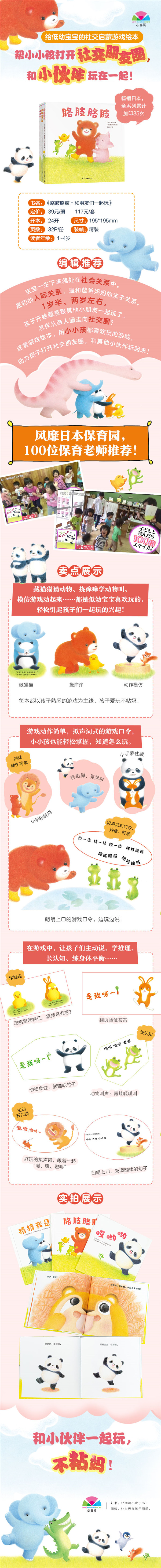 游戏是孩子与生俱来的活动,能为孩子提供和别人交往的机会,扩大孩子的社会交往范围,是同伴交往重要的途径。在同伴游戏中,孩子可以学会和人交流沟通,养成等待、轮流、分享、合作等行为。但孩子的认知水平及游戏经验的多少,会影响孩子同伴游戏的方式和体验。《胳肢胳肢·我会和朋友玩》中,每本都以宝宝熟悉喜欢的游戏——藏猫猫、挠痒痒、假想游戏为主线,展示了动物宝宝们开心玩在一起的画面,结合极具韵律的文字,爸妈在共读时,可以和宝宝互动玩起来,让宝宝感受和人游戏带来的乐趣;再者,游戏有趣、易模仿,简单的手部和脚部动作,小宝宝也能轻松掌握,知道玩什么、怎么玩。日本100位保育,让孩子们开心说、大声笑,快速破冰,玩在一起。另外,游戏自带猜一猜、学一学的特征,亲子共读时,孩子能跟着游戏观察画面、对比细节、调动自己已有的生活经验,主动跟着游戏开口说、学推理、长认知。(心喜阅出品)...